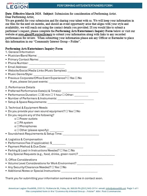 For Performing Artist: We are grateful for your submission and for sharing your talent with us. You agree that all information you are about to provide is legal and your own content. That you won't misrepresent yourself or any parties with the information you provide. Also for clarity we will keep your information in our files for the next six months, and should an event opportunity arise that aligns with your style and availability, we will reach out using the contact details you provided. If you would like to submit a performer’s request, please complete the Performing Arts/Entertainers Inquiry Form below or visit our website at www.alpost99.org/performers to submit your information along with links to any recorded performances for review. When submitting your information please ask any Officer or Bartender to place this information in our “Community Interest Group – Folder”.